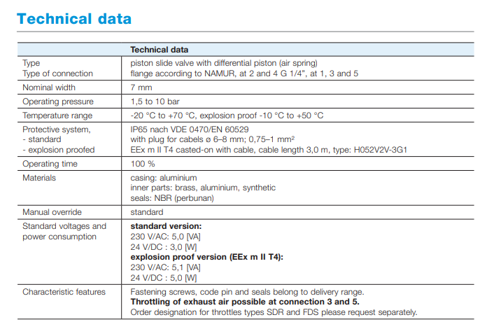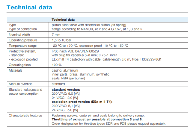 5/2-way NAMUR control valve for driving double-acting actuators of types of AD, GTD, GCD and ETD.