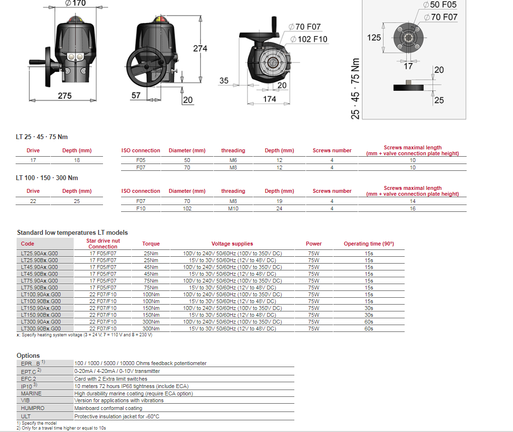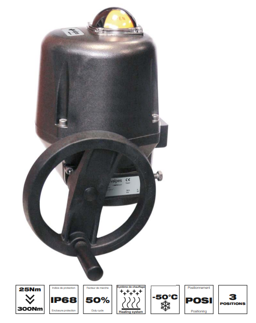 Electric actuator with aluminium housing designed for the low-temperature environment (-50 °C), with manual override by a hand wheel and for torques from 25 to 300Nm in accordance with CE-ROHS-REACH Directives.
