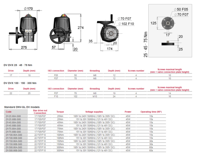 Electric actuator with aluminium housing, and DNV-GL and ATEX approval, designed for shipbuilding. Manual override by hand wheel and torques from 25 to 300Nm. Accordance with CE-ROHS-REACH Directives.