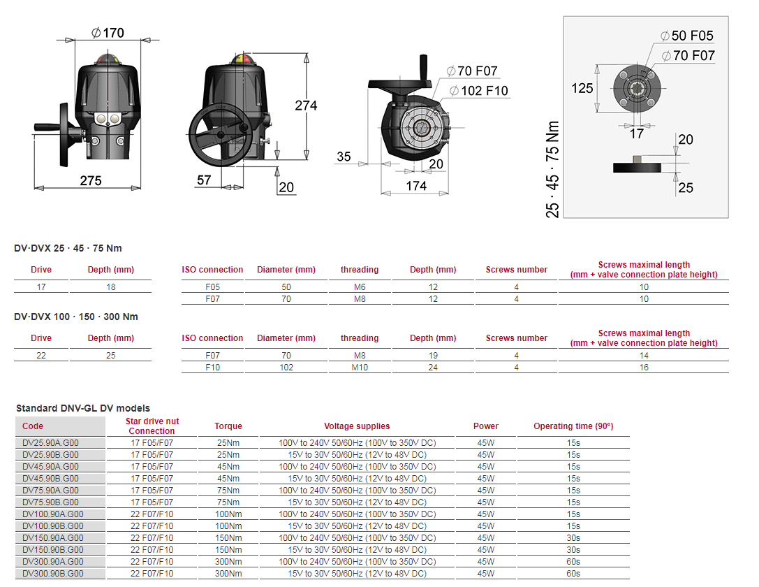 Electric actuator with aluminium housing, and DNV-GL and ATEX approval, designed for shipbuilding. Manual override by hand wheel and torques from 25 to 300Nm. Accordance with CE-ROHS-REACH Directives.