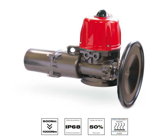 Electric actuator, aluminium housing, and polyamide PA6 UL 94 V-0 or aluminium cover (option) with manual override by hand wheel, for torques from 600 to 240Nm and in accordance with CE-ROHS-REACH Directives.